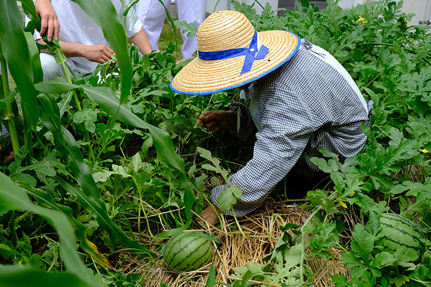 訓練のひとつとして、身体が動かせる方には、農作業なども取り入れています。土と触れあいながら、収穫時にはみなさん嬉しそうな笑顔を見せてくれます。「自分ができる」という喜びを多くの方に味わっていただきたいですね。